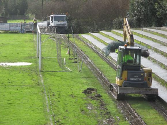 As máquinas xa traballan desde hoxe no interior do campo. A súa primeira labor será preparar o terreo para posteriormente dotalo de herba artificial, un dos principais obxectivos do proxecto de modernización da instalación.