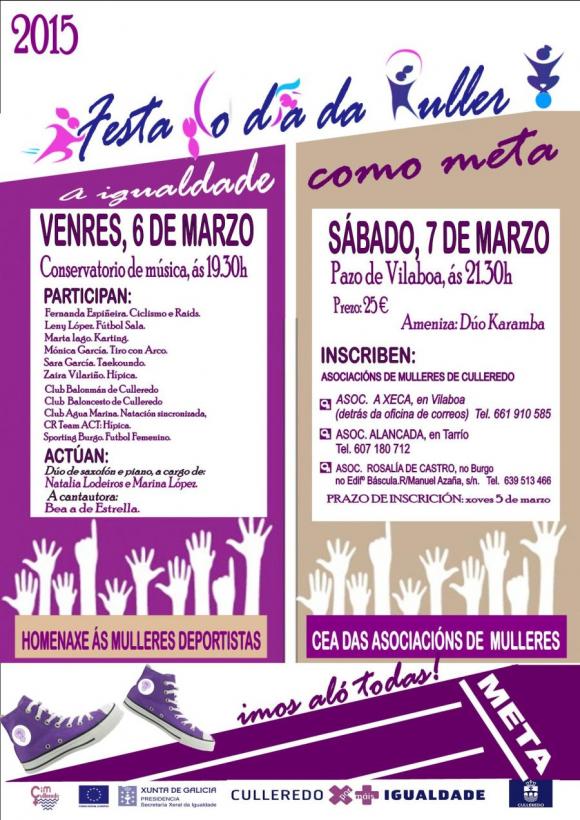 Os actos polo Día da Muller continuarán o sábado 7 coa tradicional Cea das Asociacións de Mulleres. Será no Pazo de Vilaboa ás 21.30 horas cun prezo de 25 euros.