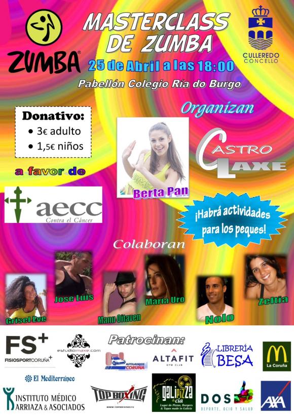 Este fin de semana Culleredo albergará unha xornada de deporte solidario para colaborar na loita contra o cancro. Ás 18.00 horas do sábado, celebrarase no pavillón do colexio Ría do Burgo unha masterclass de Zumba a cargo da monitora Berta Paz á que poderán asistir persoas de todas as idades.