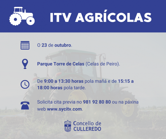 A Unidade Móbil 03 de inspección técnica de Agrícolas desplazarase ao Concello de Culleredo nas seguintes datas e ubicacións: