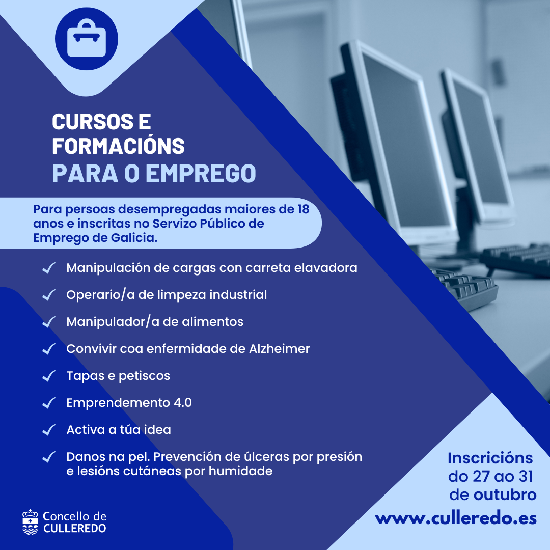 O Concello de Culleredo lanza un ambicioso plan de formación destinado preferentemente a desempregados e rexistrados no Servizo Público de Emprego con varios cursos que terán 90 prazas e que darán comezo durante o mes de novembro. Os cursos ofertados abarcan desde hostalería, limpeza industrial, manipulación de alimentos, prevención no ámbito sociosanitario, manipulación de cargas ou fomento do emprendemento. Todas estas accións formativas impartiranse no centro Pablo Picasso e os interesados poderán inscribirse do 27 ao 31 de outubro directamente desde a páxina web municipal.