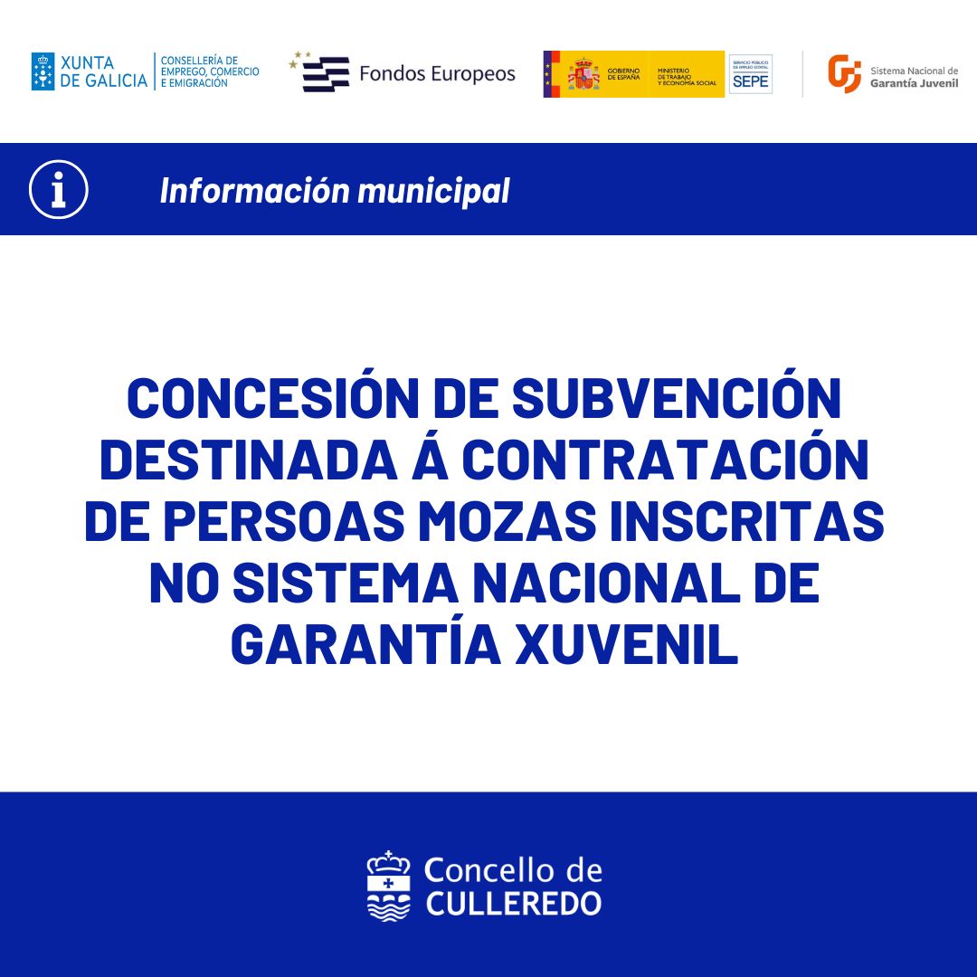 A Consellería de Emprego, Comercio e Emigración, en data 29/10/2025, aproba ao Concello de Culleredo a concesión dunha axuda, solicitada segundo a Orde de convocatoria, do 13 de agosto de 2025 pola que se aproban as bases reguladoras para a concesión de subvencións destinadas á contratación de persoas mozas inscritas no Sistema nacional de garantía xuvenil, no ámbito da Comunidade Autónoma de Galicia, a través da colaboración con entidades locais, cofinanciadas pola Unión Europea no marco do Programa FSE+ Galicia 2021 - 2027, e se procede á súa convocatoria para o ano 2025.