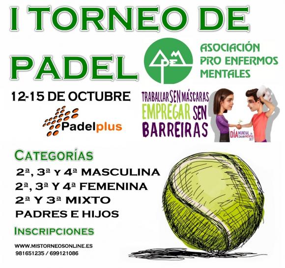 Os próximos días 12,13,14 e 15 de outubro terá lugar nas instalacións de Padelplus - Culleredo o primeiro torneo de Pádel solidario de APEM (Asociación Pro Enfermos Mentais).