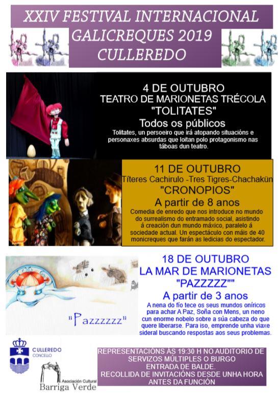 Chega a Culleredo o XXIV Festival Internacional de Galicreques 2019. E faino da man de tres espectáculos que terán lugar no Auditorio do Edificio de Servizos Múltiples do Burgo. 'Tolilates', de Teatro de Marionetas Trécola, o 4 de outubro. 'Cronopios', de Títeres Cachirulo-Tres Tigres- Chachakún, o día 11 de outubro. E 'Pazzz', de La Mar de Marionetas, o día 18 de outubro.