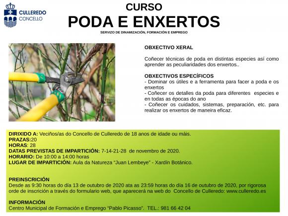 O Concello de Culleredo, a través da área de dinamización, formación e emprego, organiza un curso de ‘Poda e enxertos’ para veciños e veciñas do municipio con máis de 18 anos. O período de preinscrición comeza o próximo 13 de outubro ás 9:30 horas e cubriranse prazas por estrita orde de solicitude.