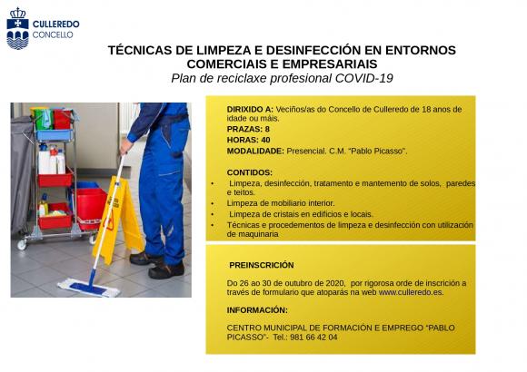 Para o curso están reservadas 8 prazas, en modalidade presencial, que se desenvolverá en 40 horas. A preinscrición irá do 26 ao 30 de outubro de 2020, por rigorosa orde de inscrición a través do formulario que as persoas interesadas poderán atopar na web municipal. Os contidos para desenvolver constarán de temas baseados en limpeza, desinfección e tratamento de chans, paredes e teitos; limpeza de mobiliario interior; limpeza de cristais e técnicas e procedemento de limpeza e desinfección con utilización de máquinas.