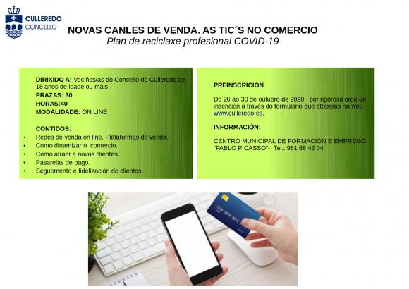 Para este curso, están contempladas un número de prazas de 30, en modalidade en liña e de 40 horas de duración. O prazo de inscrición é o mesmo que o comentado anteriormente. Os contidos para desenvolver versarán en temas baseados en redes de venda; como dinamizar o comercio; como atraer a novos clientes; pasarelas de pago ou seguimento e fidelización de clientes.