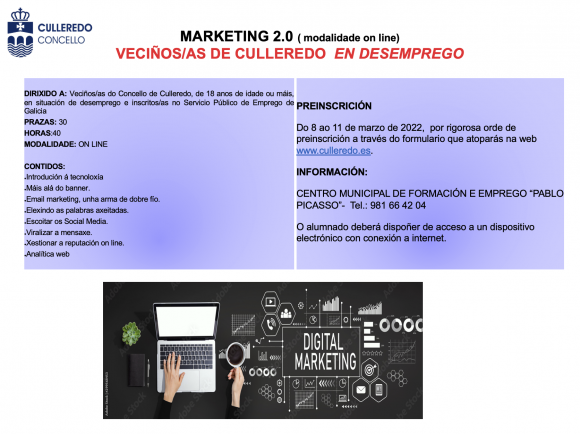 O Concello de Culleredo tamén pon a disposición da veciñanza un curso en liña no ámbito do marketing 2.0 e para persoas desempregadas. Está dirixido ás veciñas e veciños de Culleredo, de 18 ou máis anos, en situación de desemprego e inscritos e inscritas no Servizo Público de Emprego de Galicia. Haberá 30 prazas dispoñibles. Como se trata da modalidade enliña, o alumnado deberá dispoñer de acceso a un dispositivo con conexión a Internet.