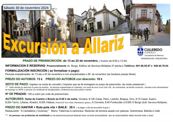 O Concello de Culleredo organiza unha excursión a Allariz o próximo 30 de novembro con 100 prazas dispoñibles. O prazo de preincrición abrirase o mércores 13 de novembro e pechará o venres 22 de novembro. Poderáse realizar de xeito presencial na segunda planta do Edificio de Servizos Múltiples do Burgo ou nos teléfonos 981 66 55 97 e 649 40 76 04 en horario de 9:00 a 13:30 horas.
