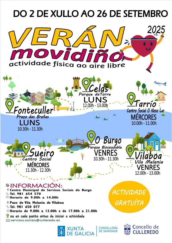 Todas as sesións serán gratuítas e non será necesario realizar unha inscrición previa, abonda con que as persoas interesadas estean nos lugares sinalados uns minutos antes do inicio de cada actividade. Pódese obter información no centro de Servizos Sociais do Burgo, no 981 654 570, en Vila Melania no 981 650 077 ou en servizos.sociais@culleredo.es.